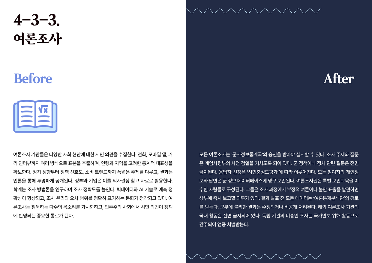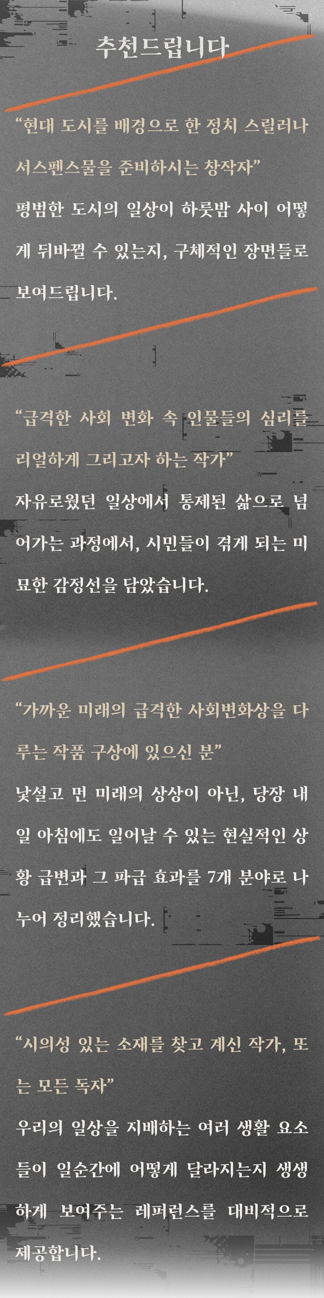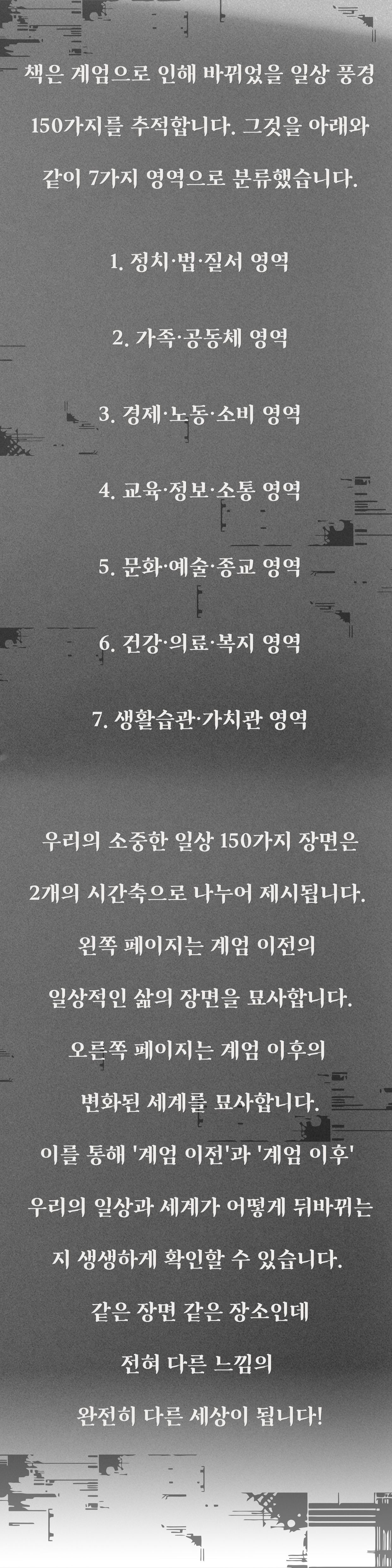1-2. 치안과 통제 1-2-1. 지하철역 보안 검색 1-2-2. 방송국 프로그램 심의 1-2-3. 야간 통행 1-2-4. 주거지 순찰 1-2-5. 가택 조사 1-2-6. 신분증 확인 1-2-7. 통신 감청 1-2-8. 집회 관리