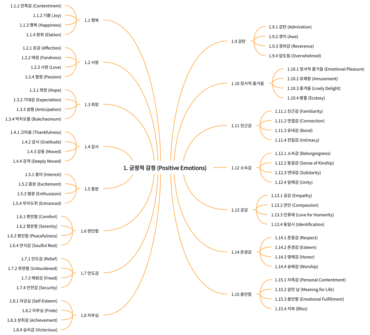 1.1 행복1.1.1 만족감 (Contentment) / 1.1.2 기쁨 (Joy) / 1.1.3 행복 (Happiness) / 1.1.4 환희 (Elation)