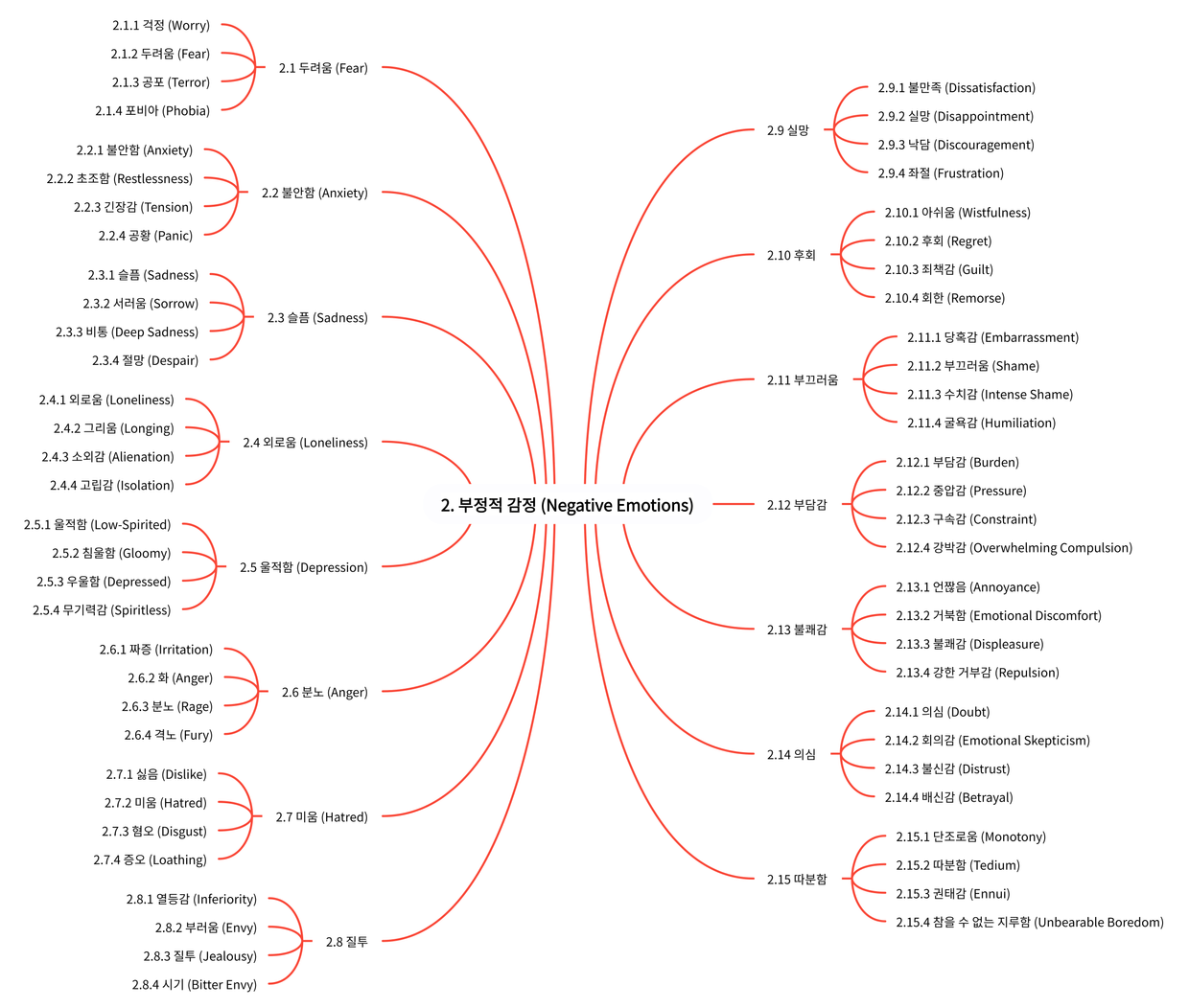 2.3 슬픔2.3.1 슬픔 (Sadness) / 2.3.2 서러움 (Seo-reo-um) / 2.3.3 비통 (Deep Sadness) / 2.3.4 절망 (Despair)