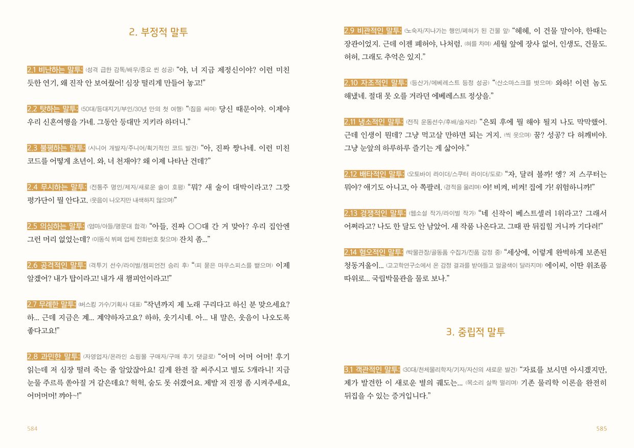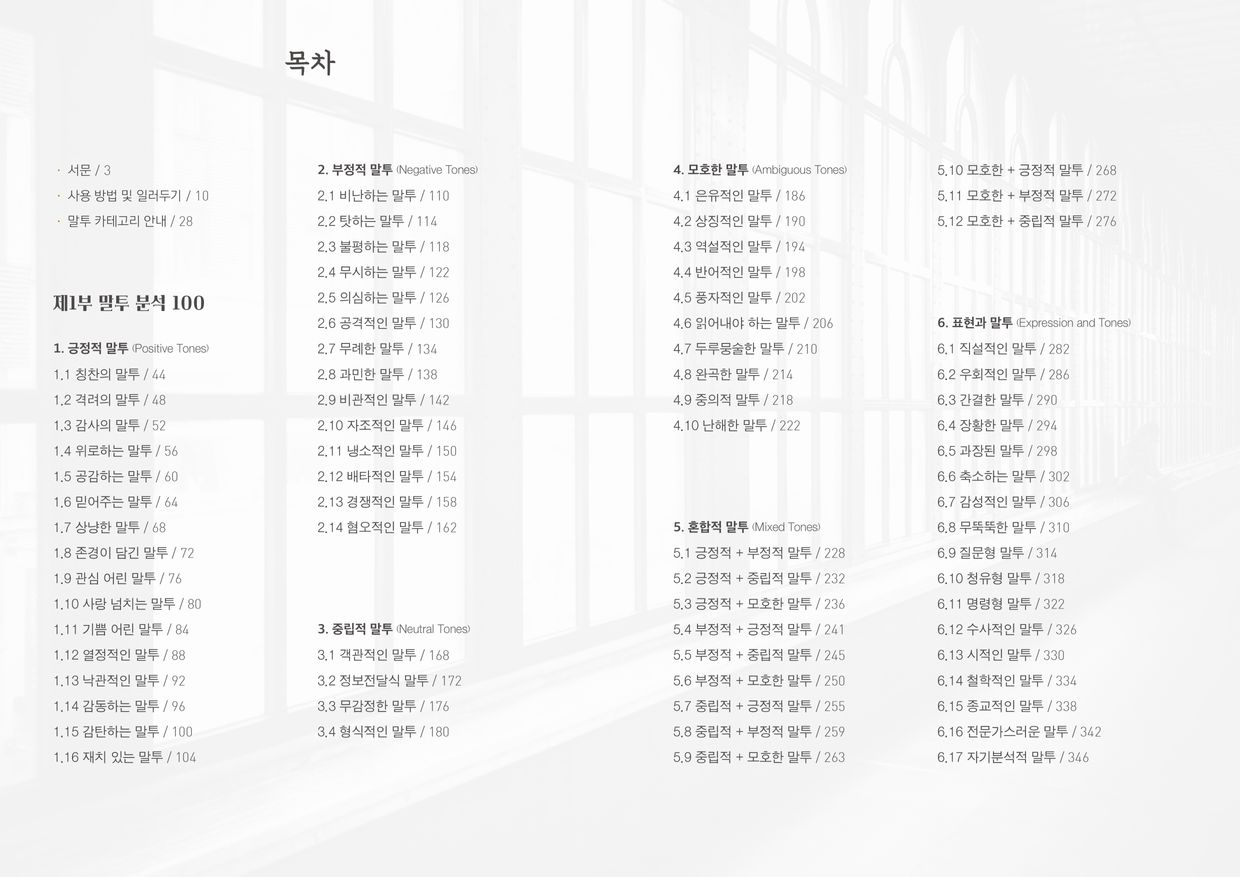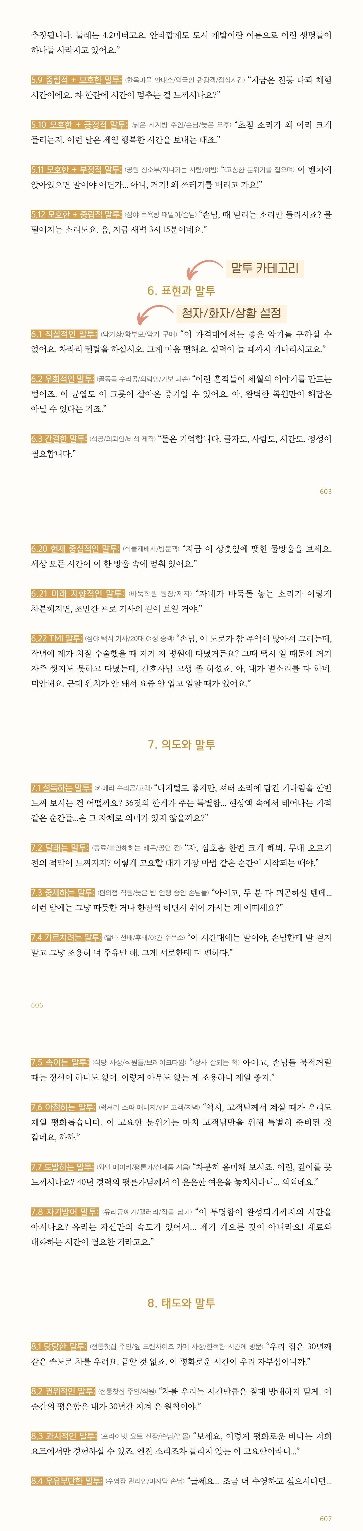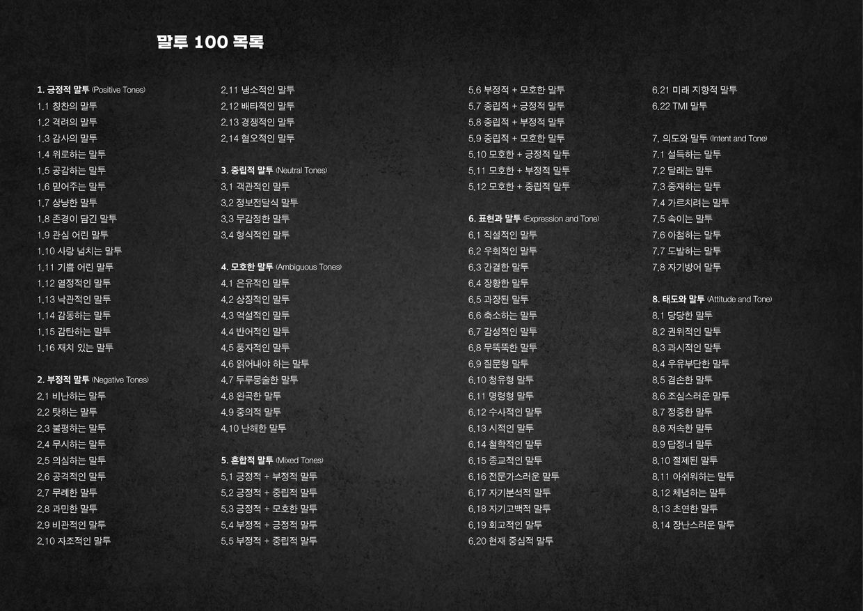 8. 태도와 말투 (Attitude and Tone)8.1 당당한 말투8.2 권위적인 말투8.3 과시적인 말투8.4 우유부단한 말투8.5 겸손한 말투8.6 조심스러운 말투8.7 정중한 말투8.8 저속한 말투8.9 답정너 말투8.10 절제된 말투8.11 아쉬워하는 말투8.12 체념하는 말투8.13 초연한 말투8.14 친근한 말투