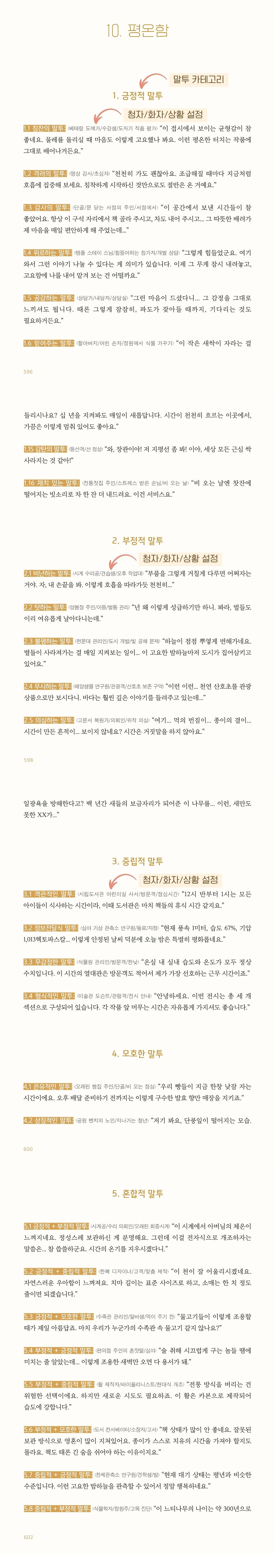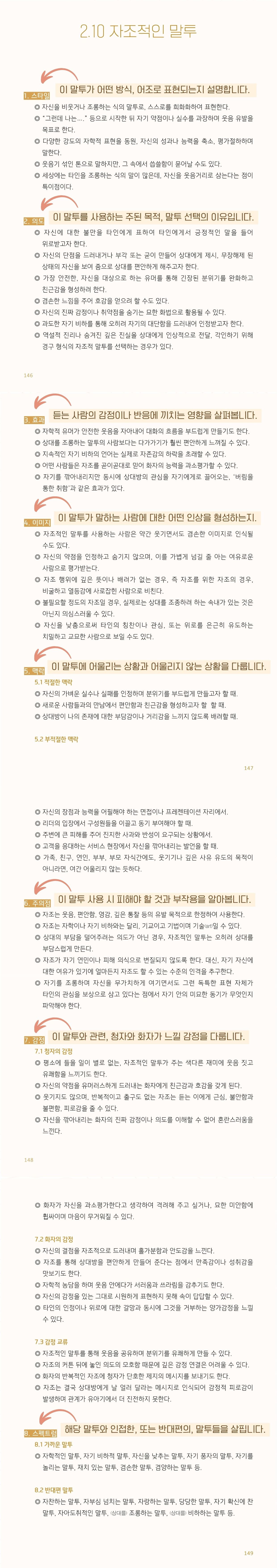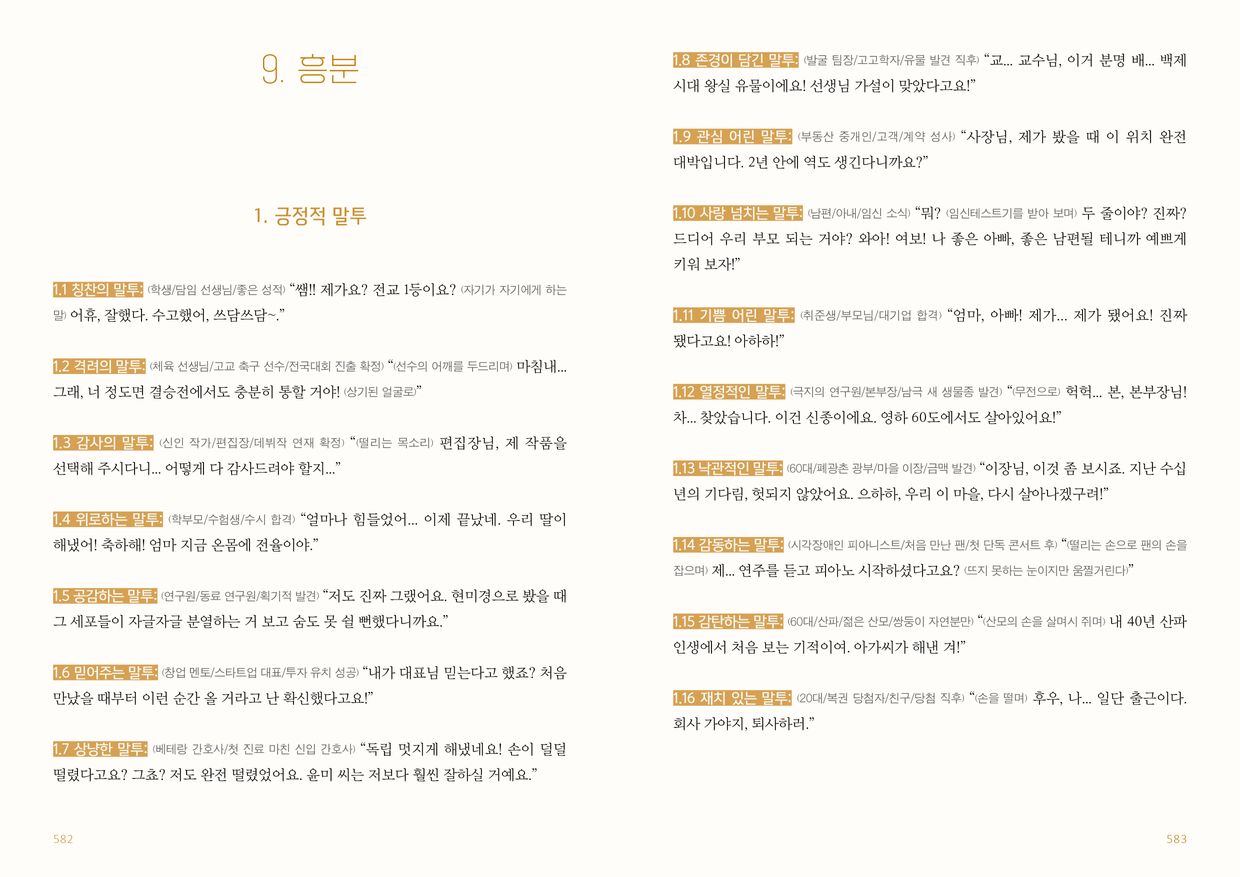 8. 태도와 말투 (Attitude and Tone)8.1 당당한 말투8.2 권위적인 말투8.3 과시적인 말투8.4 우유부단한 말투8.5 겸손한 말투8.6 조심스러운 말투8.7 정중한 말투8.8 저속한 말투8.9 답정너 말투8.10 절제된 말투8.11 아쉬워하는 말투8.12 체념하는 말투8.13 초연한 말투8.14 친근한 말투