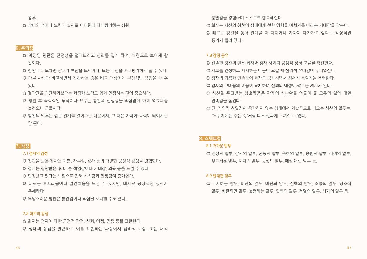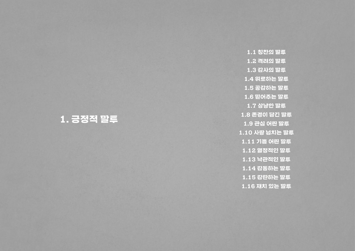 1. 긍정적 말투 (Positive Tones)1.1 칭찬의 말투1.2 격려의 말투1.3 감사의 말투1.4 위로하는 말투1.5 공감하는 말투1.6 믿어주는 말투1.7 상냥한 말투1.8 존경이 담긴 말투1.9 관심 어린 말투1.10 사랑 넘치는 말투1.11 기쁨 어린 말투1.12 열정적인 말투1.13 낙관적인 말투1.14 감동하는 말투1.15 감탄하는 말투1.16 재치 있는 말투