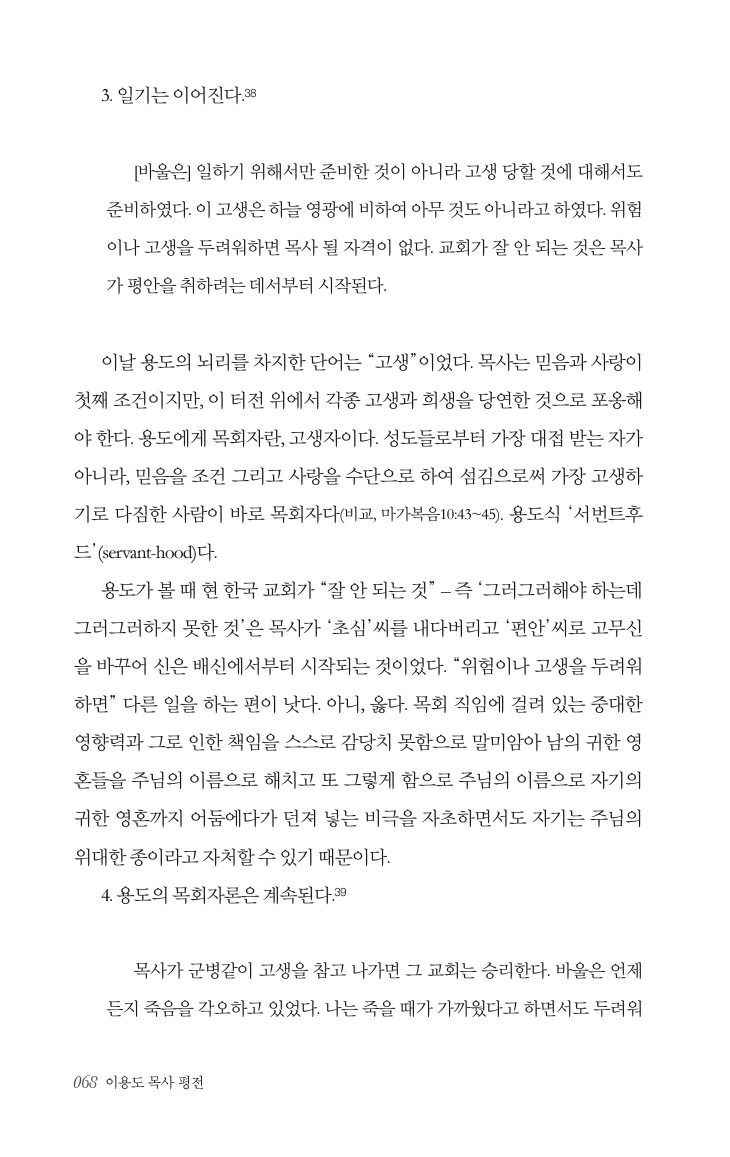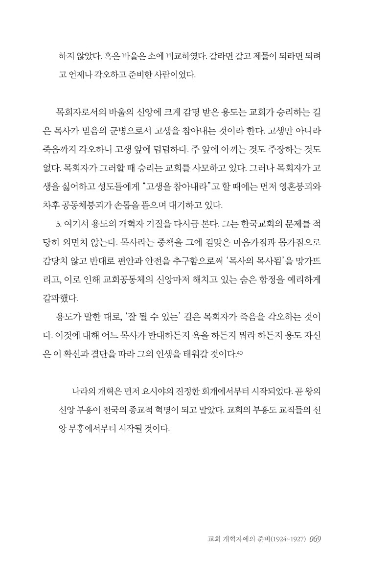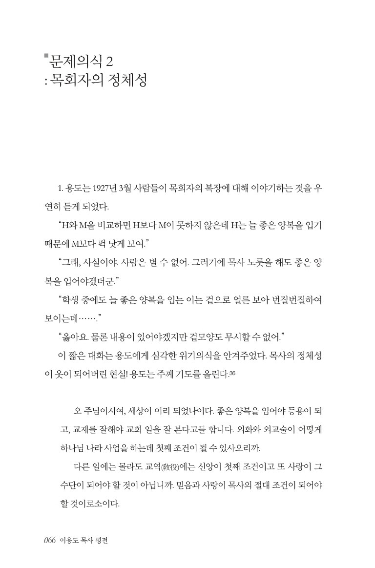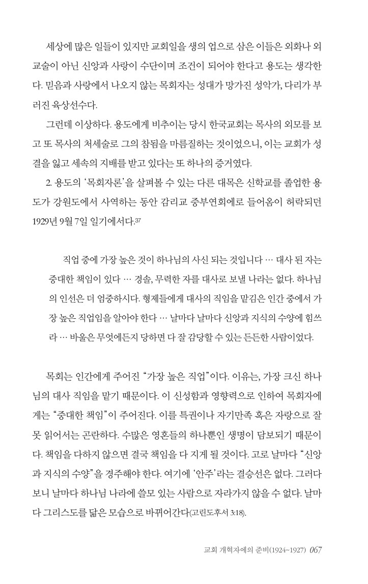 이런 일들은 갑자기 생긴 걸까? 1920년대도 비슷한 현상들이 있었다. 책의 주인공인 이용도는 1927년, “세속이 우리 교회의 문을 두드린 지 오래”라고 했다. 목회자가 좋은 옷을 입어야 쓰임을 받고, 사교술이 뛰어나야 교회 일을 잘 본다는 평가를 받는다고 지적했다. 교회를 “울긋불긋”하게 꾸미는 것에 관심이 있지, 몸과 마음을 하나님께 바치는 것은 나중이라고 꼬집었다. 이용도는 당시 한국 교회에 큰 부흥이 있지 않으면 교회의 전도가 위태롭게 될 것이라 했다. 그러면서, “주님의 일꾼들이 직업화되는 것을 여지 없이 공격하고 예수와 십자가를 재인식할 것을 주장하면서 조선기독교의 재출발”을 역설했다.