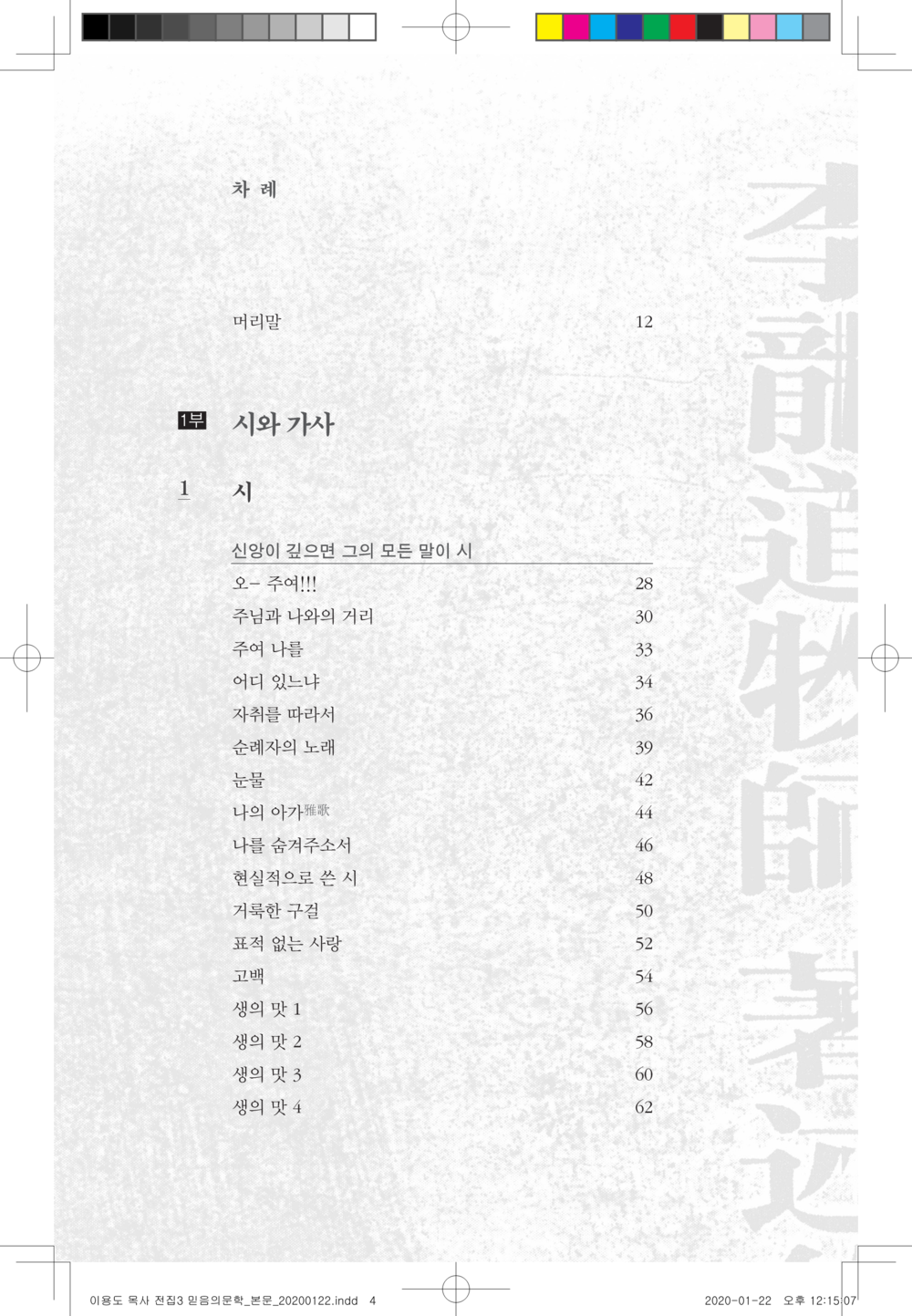 오- 주여!!! 주님과 나와의 거리 주여 나를 어디 있느냐 자취를 따라서 순례자의 노래 눈물 나의 아가(雅歌) 나를 숨겨주소서 현실적으로 쓴 시 거룩한 구걸 표적 없는 사랑 고백 생의 맛 1 생의 맛 2 생의 맛 3 생의 맛 4 수의를 지으며 나를 보시나이까! 풀어지는 마음 봄! 인생! 위로의 왕 그리스도 부활주일에 주님이 들어오시는 문