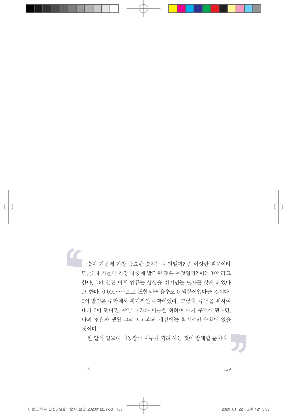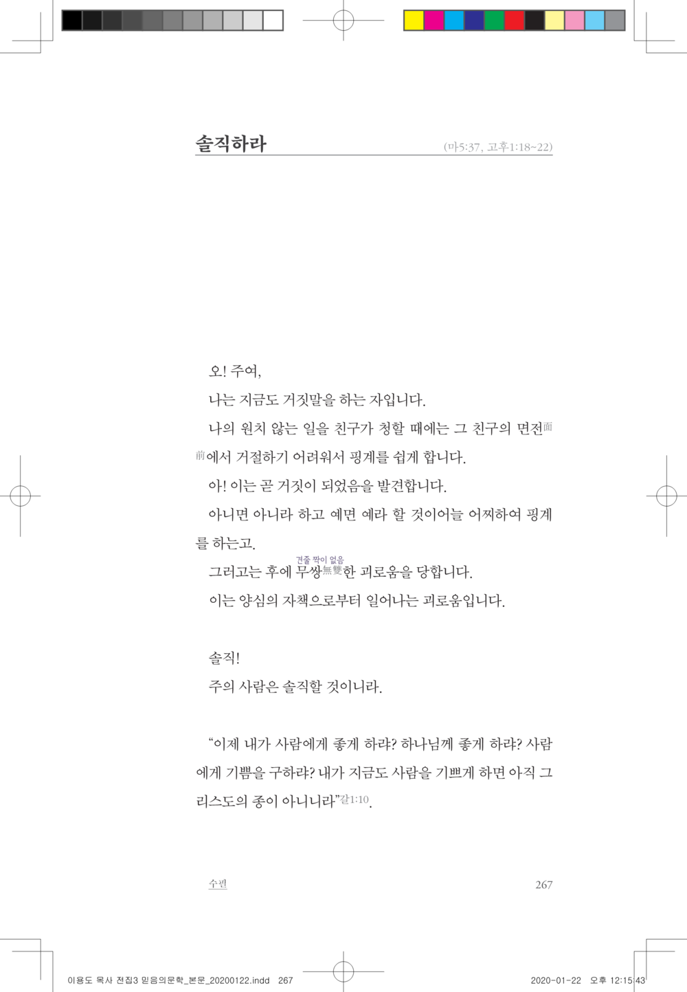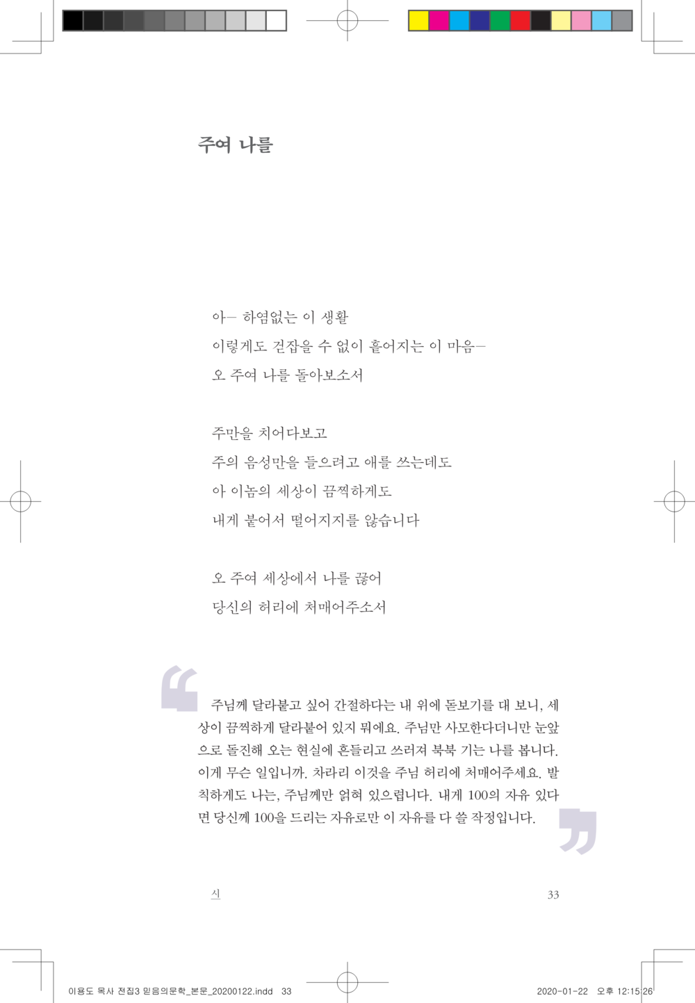 느낌표 하나로는 부족해 둘을, 둘도 모자라 셋을 찍었습니다. “오-” 하며 짜부라진 심정 쏟아낼 채비 하더니, 가장 그리운 이의 이름을 불렀습니다. 서러울 때면, 고단할 때면, 부르고 싶어지는 그 이름을 불렀습니다. 인생에서, 세상에서, 제일로 좋은 걸 나에게 주세요. 주님 당신을 나에게 주세요. 나는 나를 당신께 드리겠습니다. 사랑으로 인해 당신을 원하게 되는 나! 사랑으로 인해 나를 드리게 되는 나! 느낌표 둘로는 부족한 당신! 느낌표 셋에서 간신히 멈춘 나!