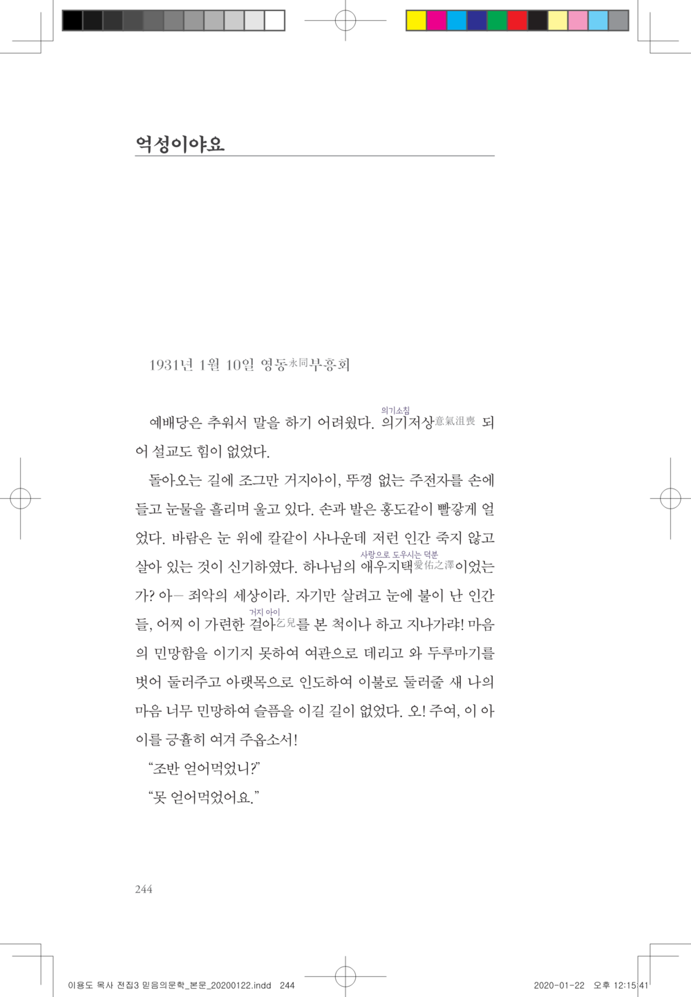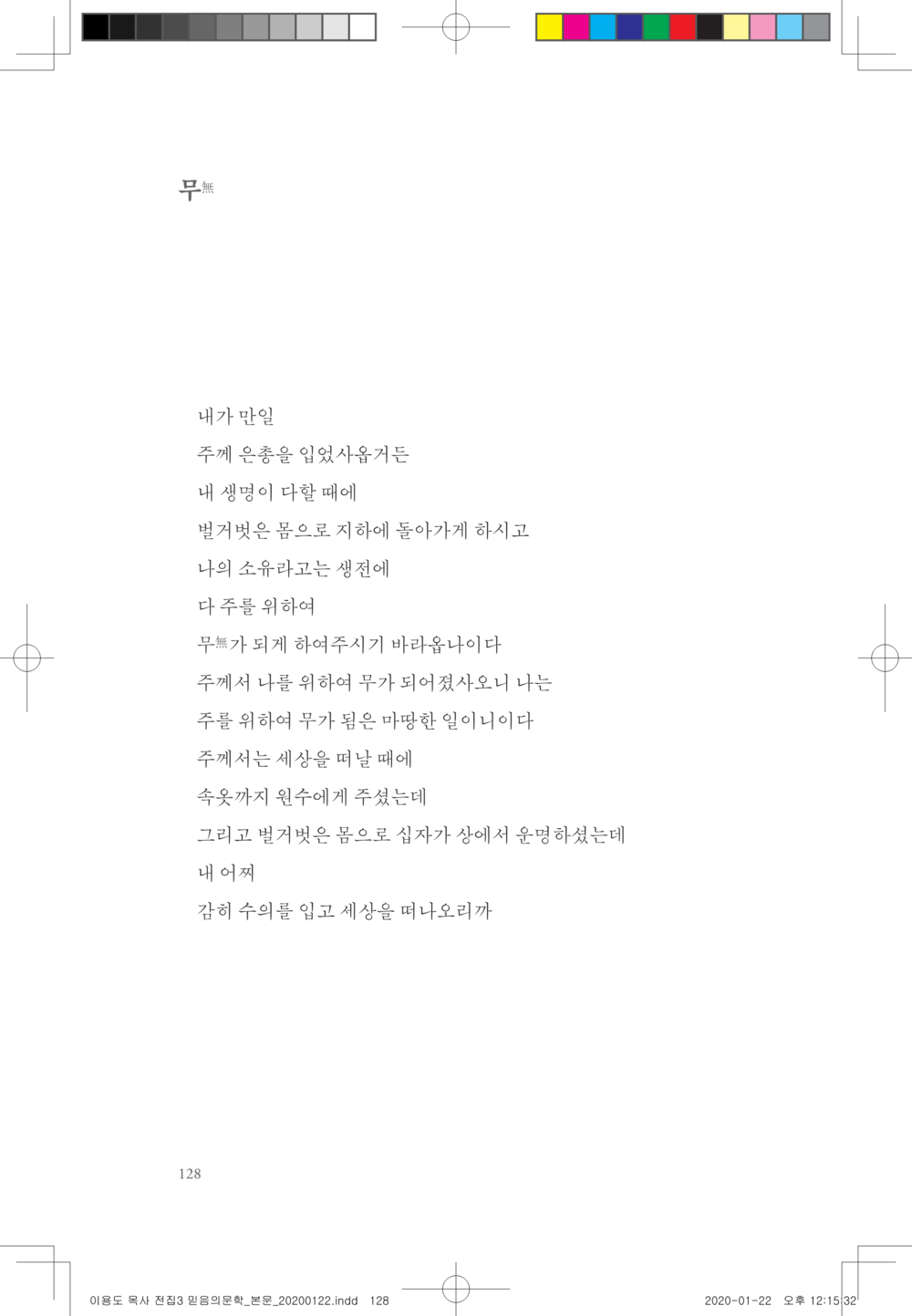시인은 “주님은 사랑이니이다”를 8번이나 반복했다. 이 선언 앞에는 한마디가 생략되어 있다, “그럴지라도”라는. “그럴지라도 주님은 사랑이니이다.” 생략시켜 더 크게 들려오는 소리다. 빚과 가난, 욕과 차별, 병과 망국, 그러한 죽음들 가운데서도 붙들어야 할 진실은, “주님은 사랑이니이다”였던 것이다. 그때는 일제강점기였고, 오늘은 부채강점기다. 생존의 위협은 어느 시대에나 있고, 고로 “주님의 사랑이니이다”도 어느 시대에나 있다.